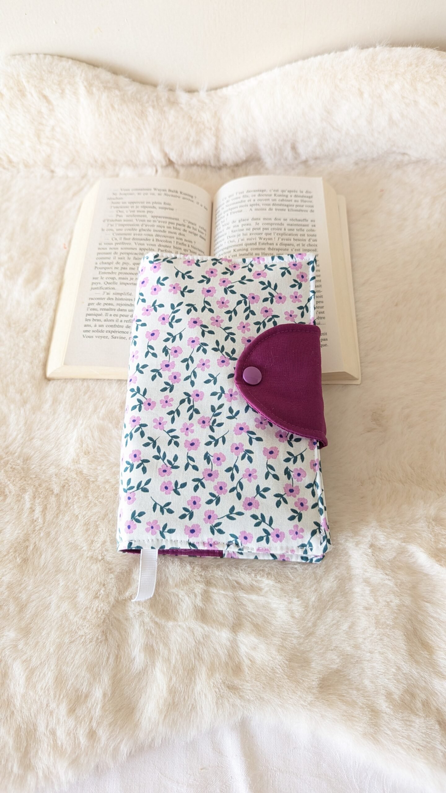 Protège livre format poche , avec un rabat sur le coté ,des fleurs violettes