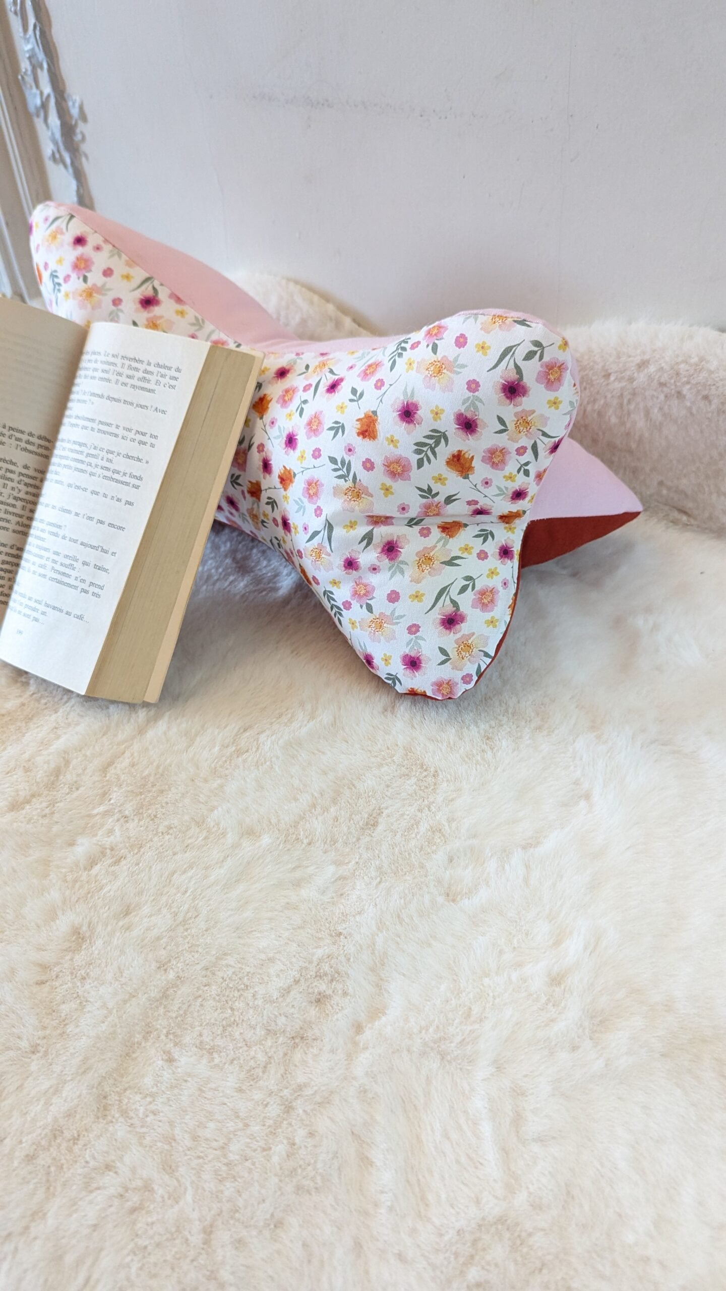 Coussin de lecture , cale nuque , des petites fleurs roses/ orange / terracotta