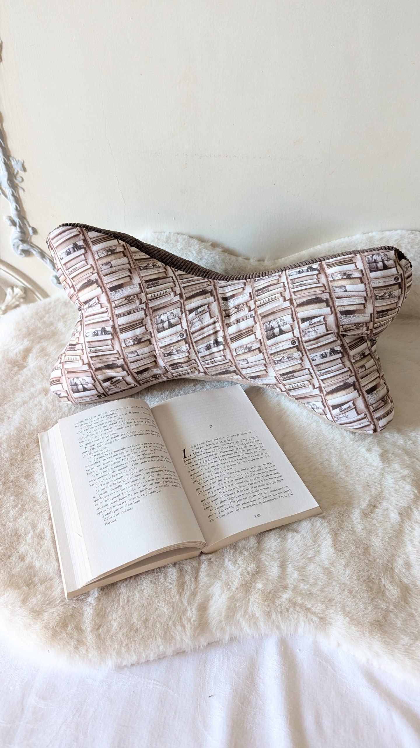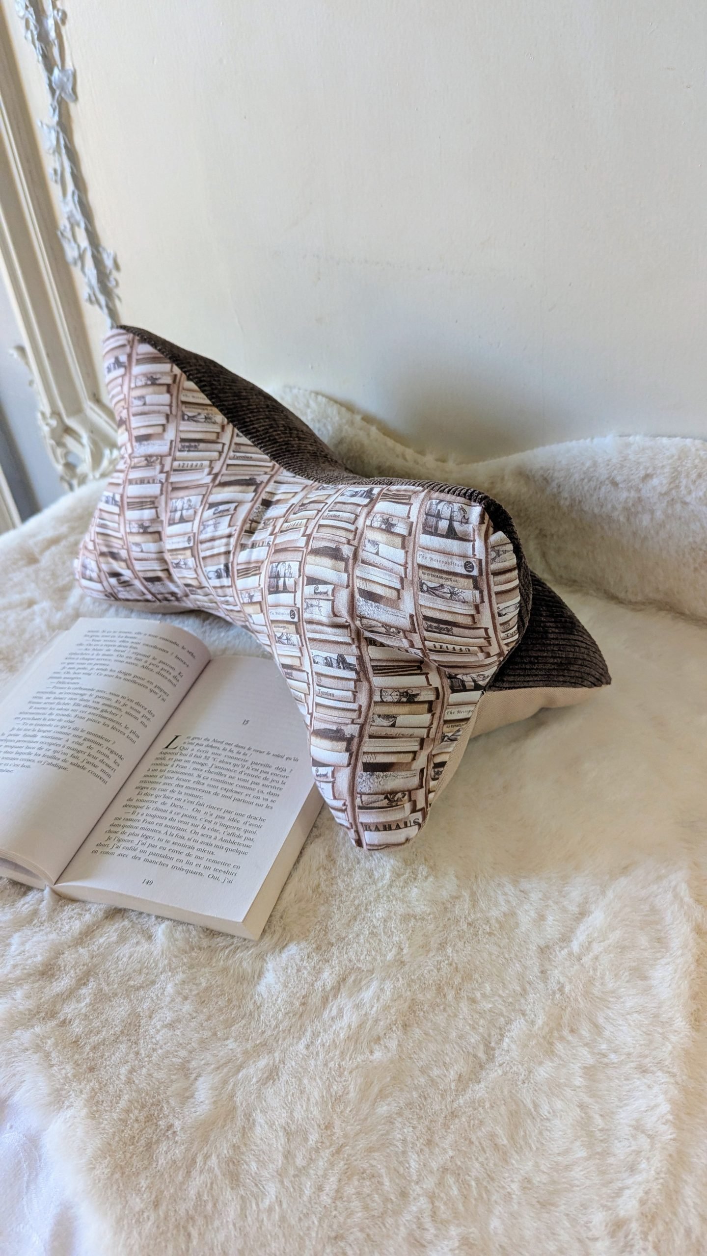 Coussin de lecture ,cale nuque ,velours marron / des livres