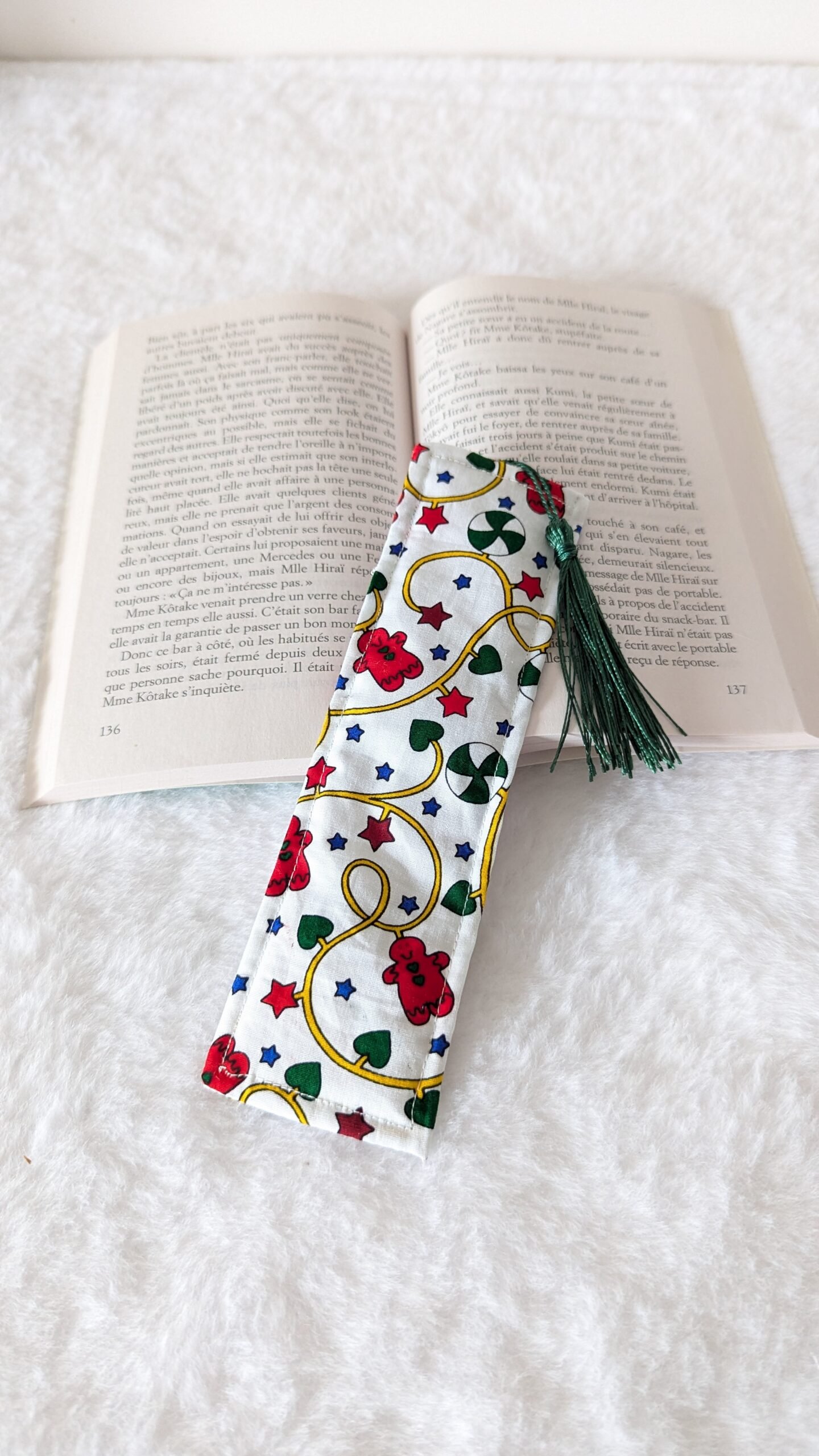 Marque page , en coton , rembourré, avec pompon , des roses de noël